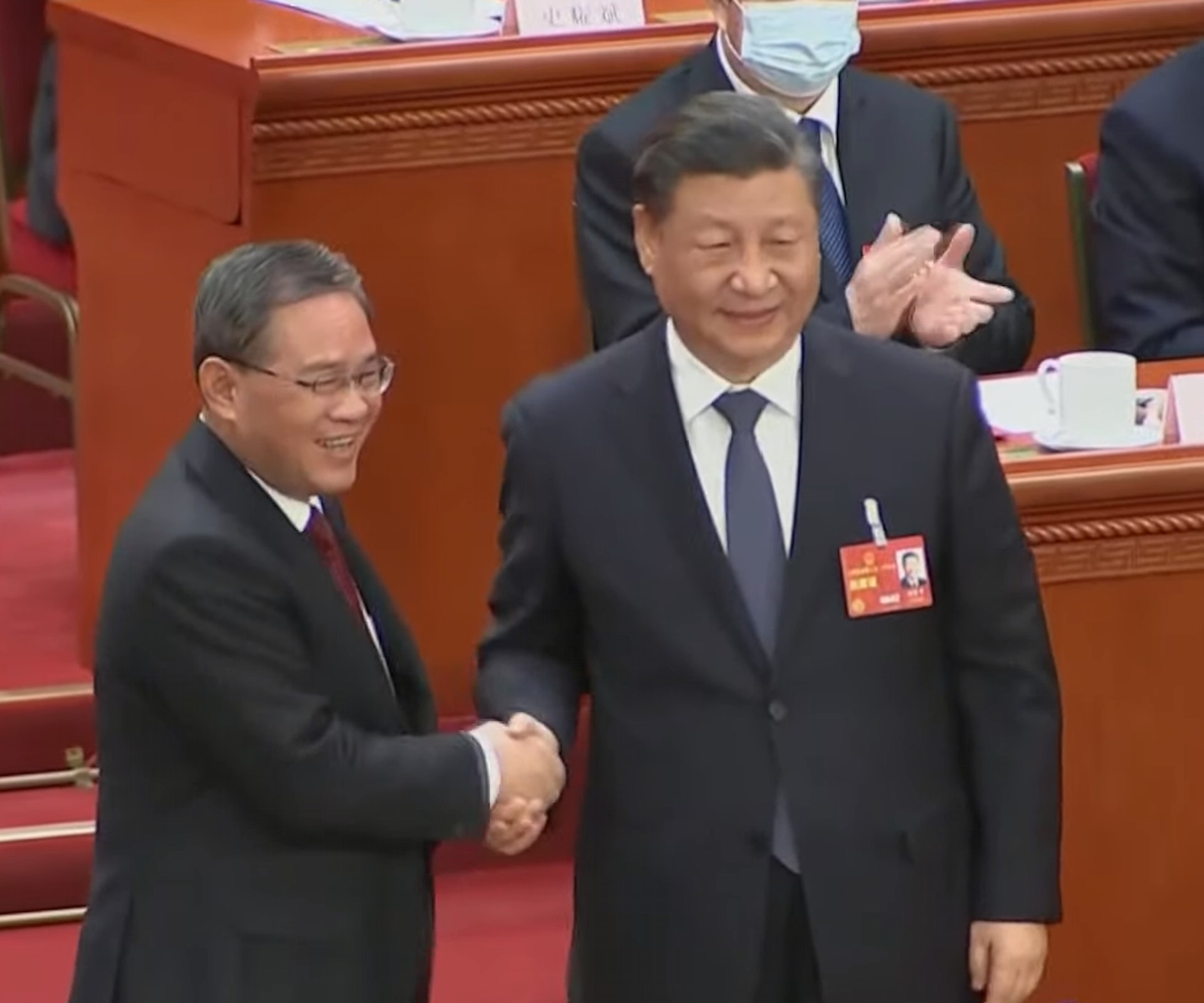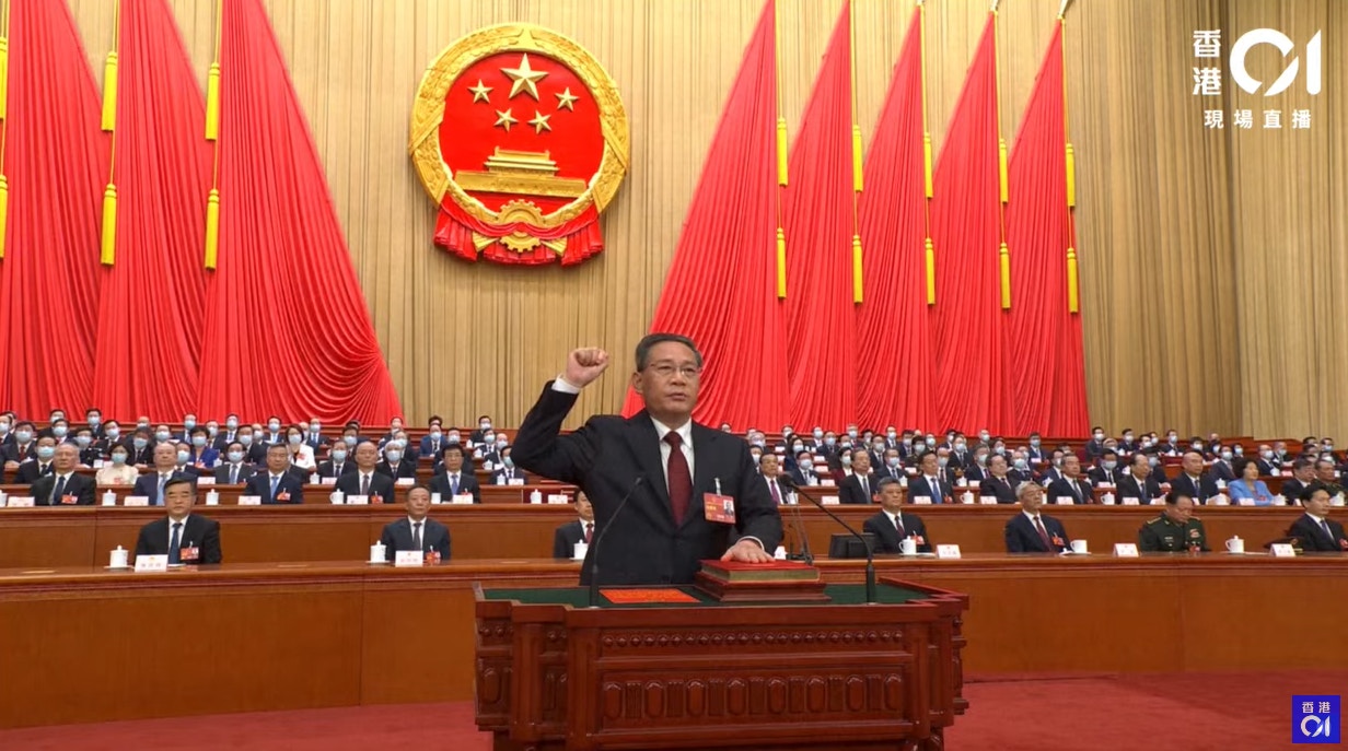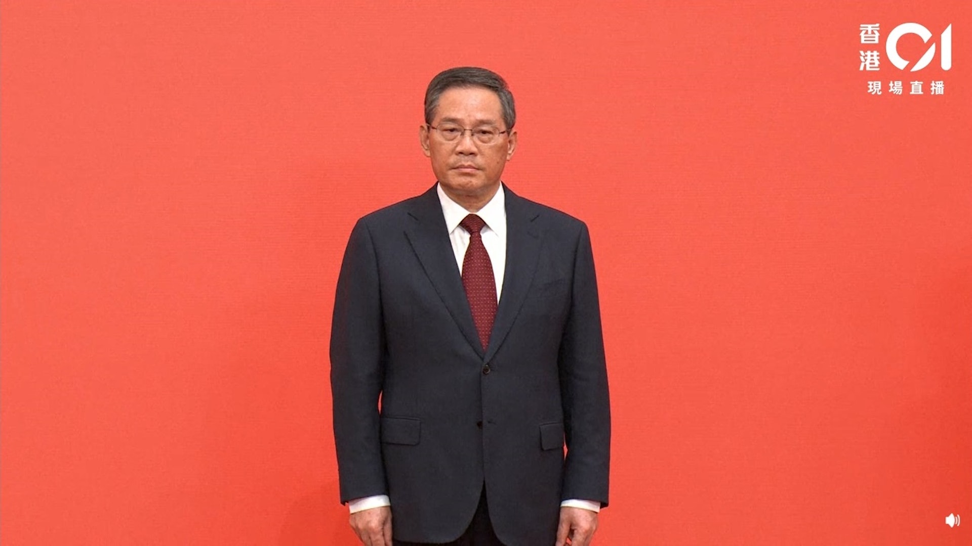 李強進行憲法宣誓。(香港01直播截圖)李強獲2936票,3票反對,8票棄權,有效票數共2947張。國家主席習近平簽署主席令,任命李強為中華人民共和國國務院總理。李強先走向習近平,兩人微笑握手致意,李強隨後走向李克強,兩人握手微笑合影,李克強後走向習近平,兩人握手合影。
