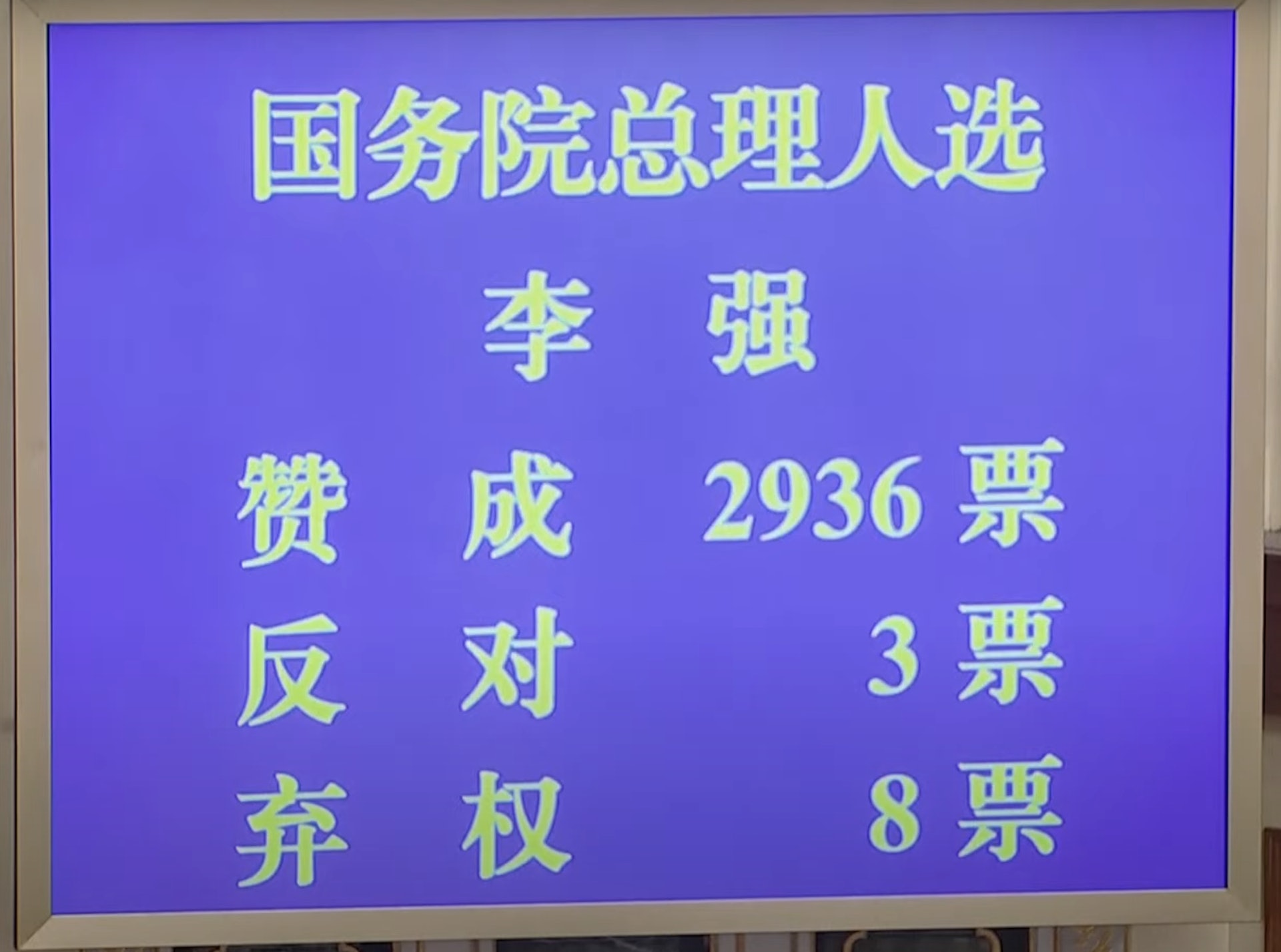 前任國務院總理李克強,2013年在第十二屆全國人大一次會議第五次全體會議上,獲得2940票贊成,3票反對,6票棄權,得票率為99.69%。 2018年的第十三屆全國人大一次會議當中,李克強以2964票贊成、2票反對,順利連任總理,也是他最後一任的五年總理任期。